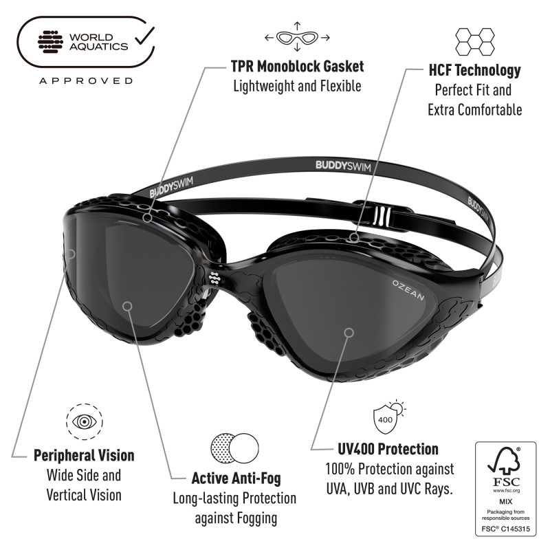 El proceso de diseño con tecnología 3D permite que las gafas Ozean disminuyan la superficie de resistencia al agua y, por lo tanto, mejoren la estabilidad de las gafas en todas las condiciones. El diseño hidrodinámico de las Ozean las convierte en las gafas ideales para las competiciones y entrenamientos de triatlón donde se está más expuesto a recibir golpes que hagan saltar las gafas de la cara.