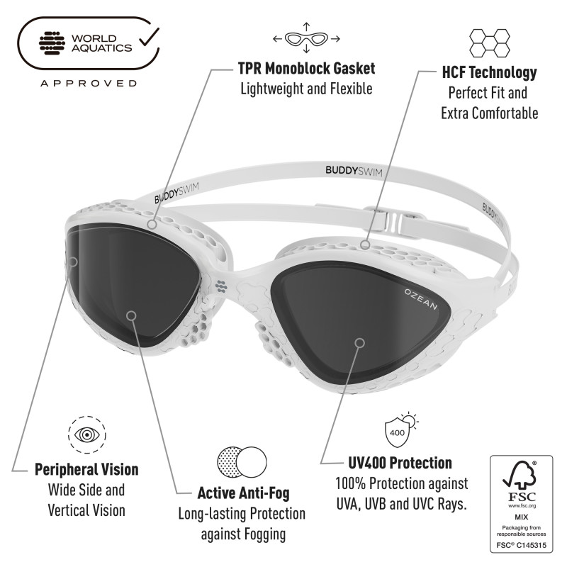 El proceso de diseño con tecnología 3D permite que las gafas Ozean disminuyan la superficie de resistencia al agua y, por lo tanto, mejoren la estabilidad de las gafas en todas las condiciones. El diseño hidrodinámico de las Ozean las convierte en las gafas ideales para las competiciones y entrenamientos de triatlón donde se está más expuesto a recibir golpes que hagan saltar las gafas de la cara.