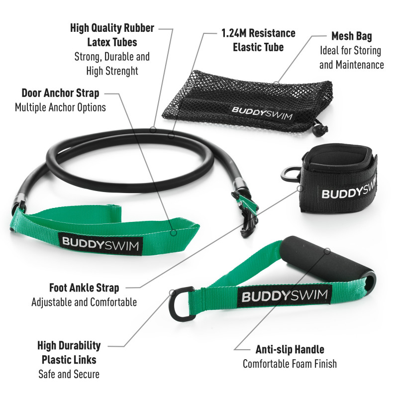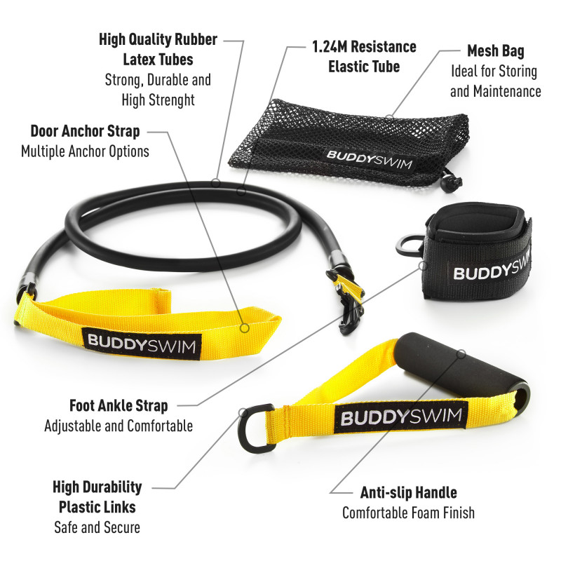 Les Buddyswim Ultimate Dryland Cords sont fabriqués à partir de cordes élastiques de qualité avec des poignées et des chevilles interchangeables. L'entraînement des nageurs hors de l'eau est un complément essentiel pour améliorer l'endurance et la technique de nage des nageurs débutants et avancés. Grâce à la possibilité d'utiliser soit la poignée, soit la chevillère, le nageur peut effectuer une multitude d'exercices hors de l'eau pour améliorer la force et l'élasticité du haut et du bas du corps.